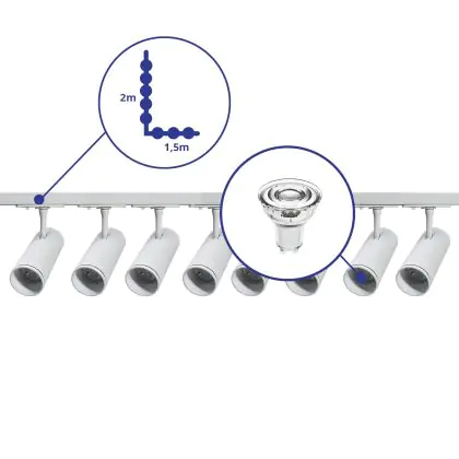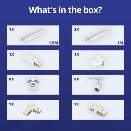 | Fabrikantnaam | Complete L shaped 1-Phase Track Set White incl. 8x Spot fixture + GU10 2700K 3W Dim – 1.5 x 2 meters | |