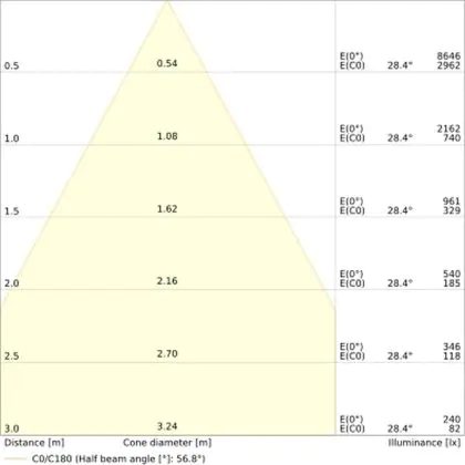 De gradenbundel geeft informatie over hoe breed het licht wordt uitgestraald. Dit zit tussen de 0 en 360 graden (D). Hoe kleiner de hoek, hoe specifieker de lichtbundel is. Over het algemeen is een smalle gradenbundel perfect voor sfeer- of accentverlichting, terwijl een brede gradenbundel ideaal is om grote oppervlaktes te verlichten.