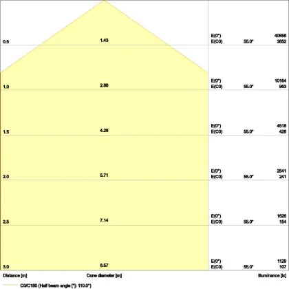 De gradenbundel geeft informatie over hoe breed het licht wordt uitgestraald. Dit zit tussen de 0 en 360 graden (D). Hoe kleiner de hoek, hoe specifieker de lichtbundel is. Over het algemeen is een smalle gradenbundel perfect voor sfeer- of accentverlichting, terwijl een brede gradenbundel ideaal is om grote oppervlaktes te verlichten.